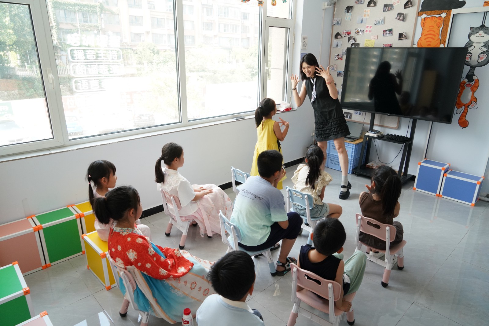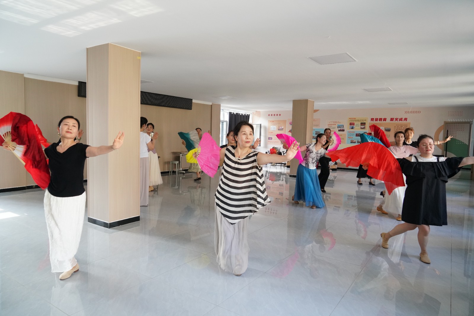 与此同时,社区二楼的活动室内同样热闹非凡。少儿口才课上,孩子们大胆表达、锻炼沟通能力;练字课程中,大家一笔一划临摹,感受汉字之美;传统文化课程通过故事讲解、互动游戏等形式,让孩子们加深对中华优秀传统文化的理解;舞蹈课上,居民们伴随着音乐舒展身姿,展现活力与朝气。多项公益课程同步开展,满足了不同居民的兴趣需求,并丰富了他们的闲暇生活。