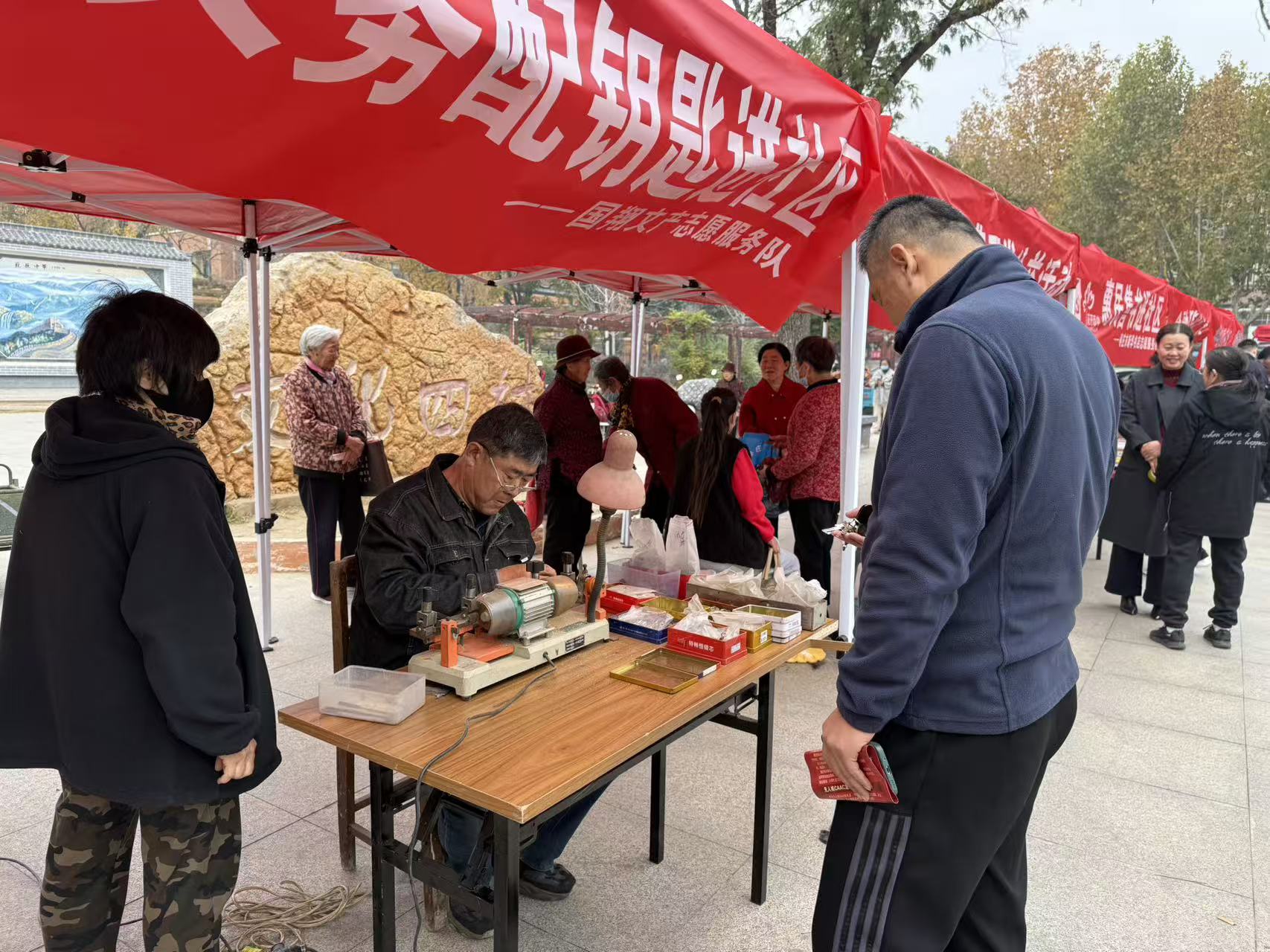 活动现场气氛热烈,服务内容丰富多样,精准对接居民日常需求。在义务配钥匙区,志愿者技术娴熟,不一会儿就将崭新的钥匙交到居民手中;免费理发区域同样备受青睐,理发师志愿者耐心询问居民喜好,精心修剪,老人们竖起大拇指称赞"手艺好、服务贴心"。一旁的政策宣传区域也毫不逊色,社区工作者与共建单位的志愿者化身“宣传员”,向居民细致讲解最新交通法规、金融理财知识,同时结合真实案例开展反诈宣传,不少居民驻足聆听。