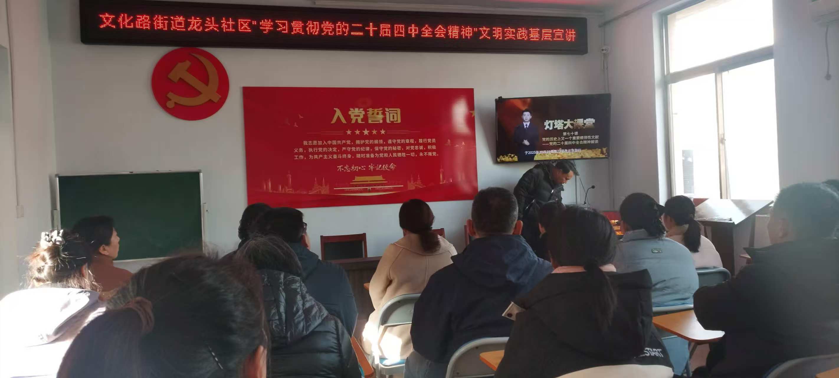 为深入学习贯彻党的二十届四中全会精神,推动全会精神在基层落地生根,12月10日,文化路街道龙头社区新时代文明实践站组织开展了党的二十届四中全会精神宣讲活动,社区党员、居民代表等20余人参加学习。