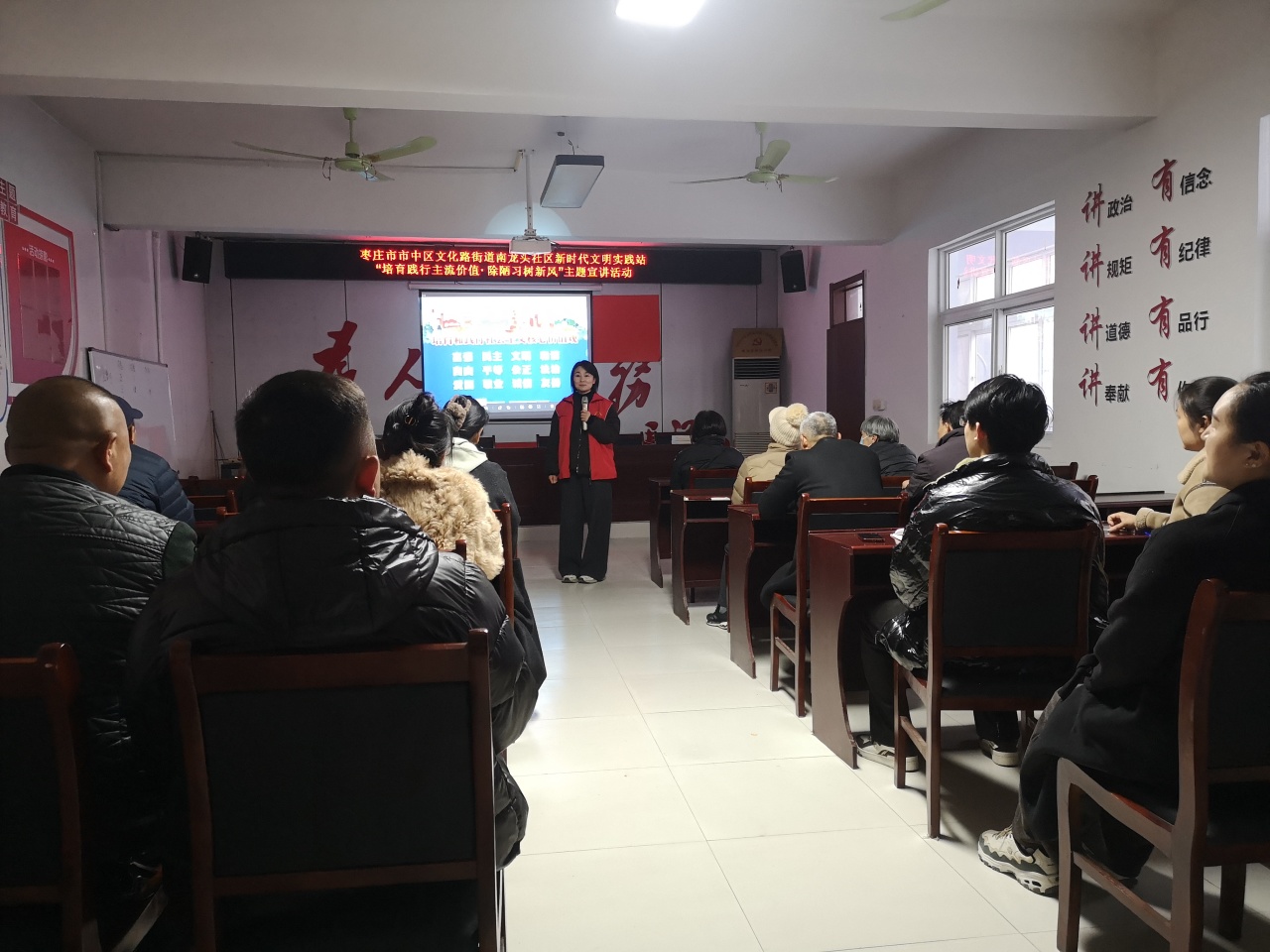 为深入弘扬社会主义核心价值观,传递辖区正能量,提升居民群众的精神文明素养, 12月10日,文化路街道南龙头社区在新时代文明实践站开展“培育践行主流价值• 除陋习树新风”主题宣讲活动。