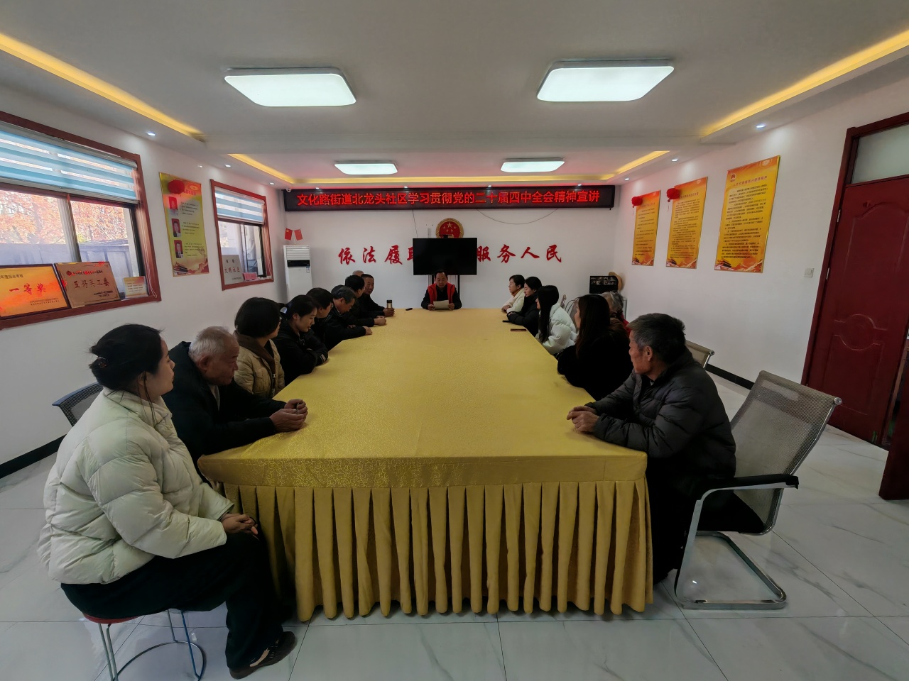 为深入学习宣传贯彻落实党的二十届四中全会精神,推动全会精神在基层社区落地生根,12月3日,文化路街道北龙头社区组织开展学习贯彻党的二十届四中全会精神宣讲,24人参与宣讲。
