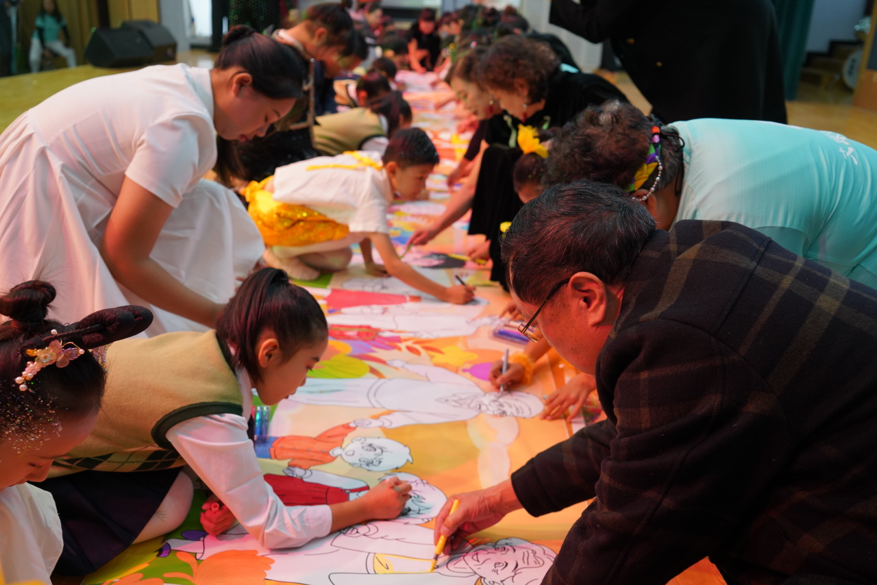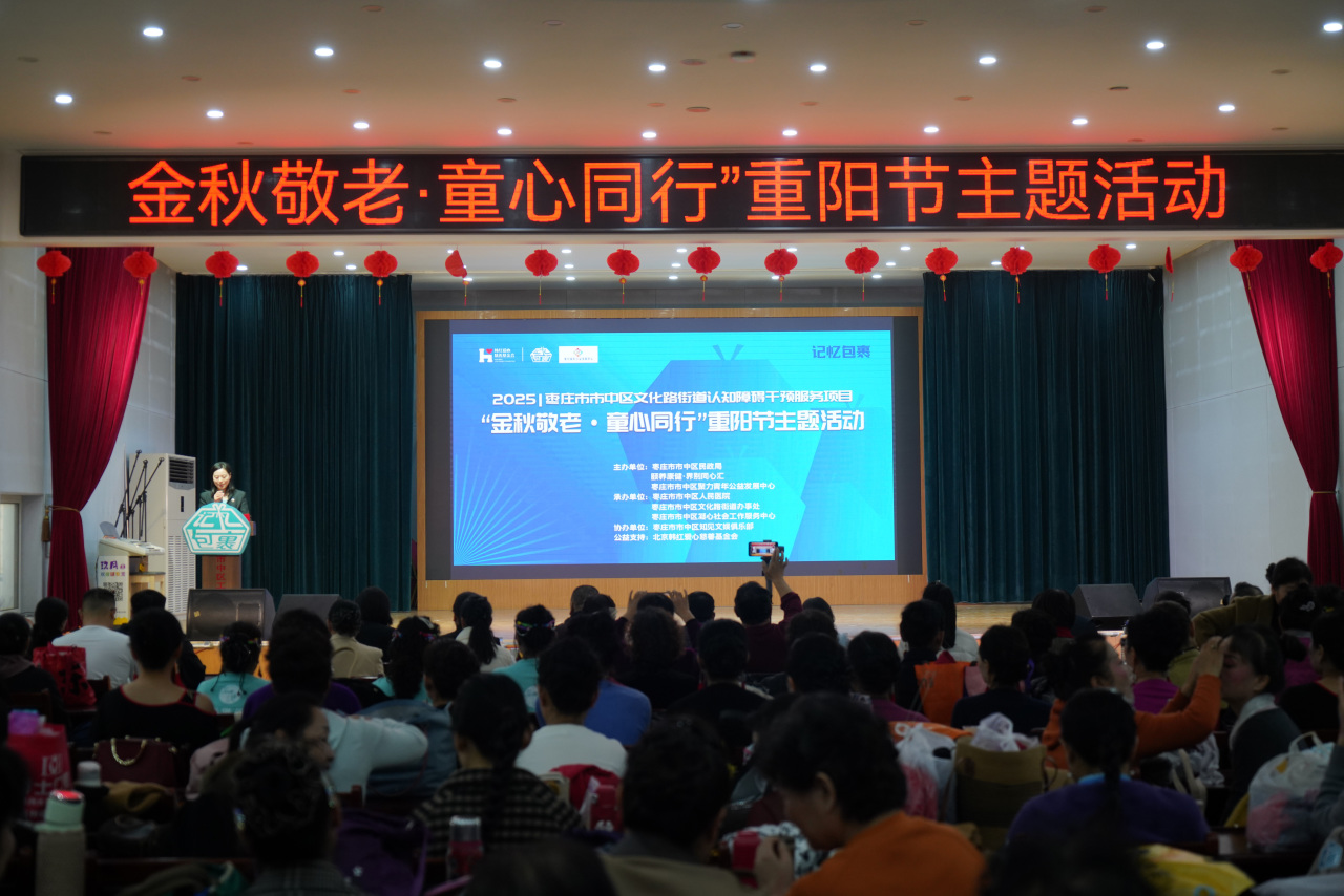 活动开始,来自市中区人民医院的专家重点讲解了阿尔茨海默病早期识别与预防等实用知识。随后,舞台上铺开百米长卷,现场的老人与儿童代表结对创作,共同绘就一幅满是生命故事的“记忆长卷”。文艺盛宴接续上演,活力四射的开场舞《嘿姑娘》点燃全场,非洲鼓《小宝贝》充满节奏感,扇子舞《万疆》大气磅礴,儿童独舞《春三月》灵动优美,朗诵节目《爸妈的谎言》《月光下的中国》及《九九重阳童心筑高台》声情并茂,深深触动了在场观众的心弦。最后,大合唱《夕阳红》《我们走在大路上》将现场气氛推向高潮,掌声与欢笑声经久不息。